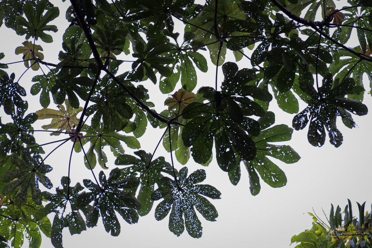 Hojas del árbol de guarumo. Estos árboles producen un fruto que es parte esencial de la dieta de los monos arañas.
