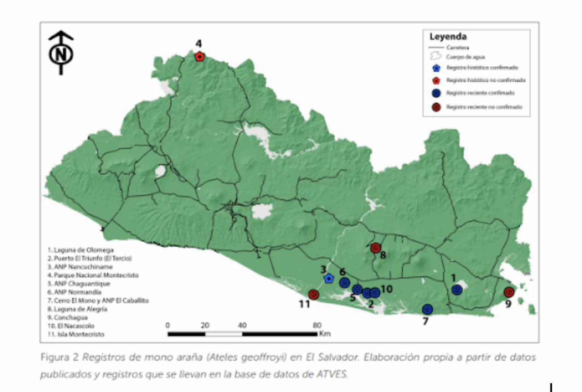 Los monos arañas son los únicos primates no humanos de El Salvador, y figuran en la lista oficial de especies en peligro de extinción del Ministerio de Medio Ambiente y Recursos Naturales (MARN). Sus refugios se encuentran  en cuatro áreas naturales protegidas de Jiquilisco: Nacascolo, Chaguantique,  Normandía y El Tercio, aunque también hay registros en la Laguna de Olomega y en Jucuarán, Usulután.