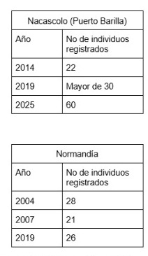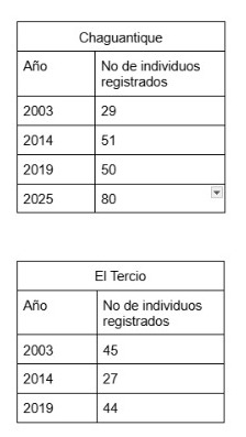 Datos obtenidos a partir del documento Programa Nacional para la Conservación del Mono Araña. Nota: la información del 2025 sobre Nacascolo fue proporcionada por un guía local, mientras que el dato del 2025 correspondiente al bosque de Chaguantique fueron facilitados por Elena Castillo, bióloga del MARN.