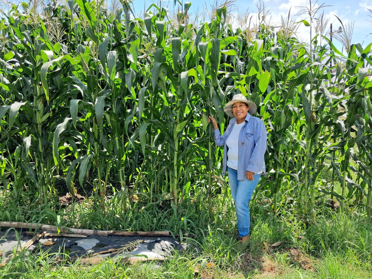 Sonia Gutiérrez, agricultora en Izalco y descendiente de pipiles, conserva semillas criollas y los conocimientos ancestrales que las acompañan. Aquí posa orgullosa junto a su milpa.