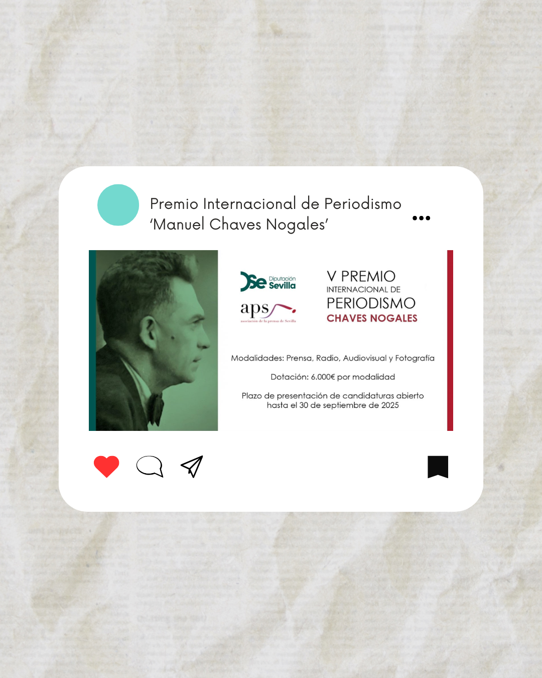 - Postula al Premio Internacional de Periodismo ‘Manuel Chaves Nogales’. Se premiarán reportajes publicados en papel o digital, radio, audiovisual y fotografía.