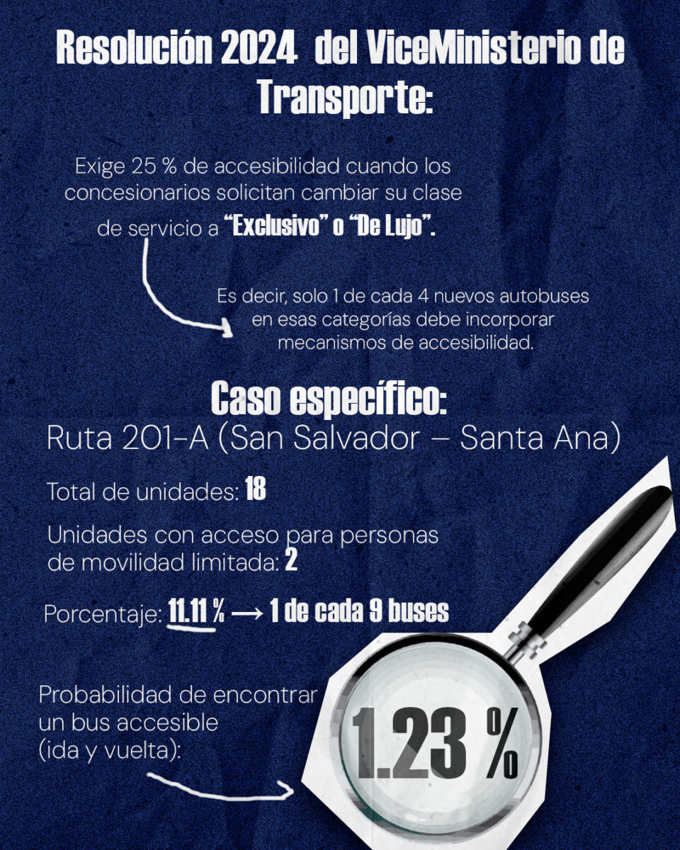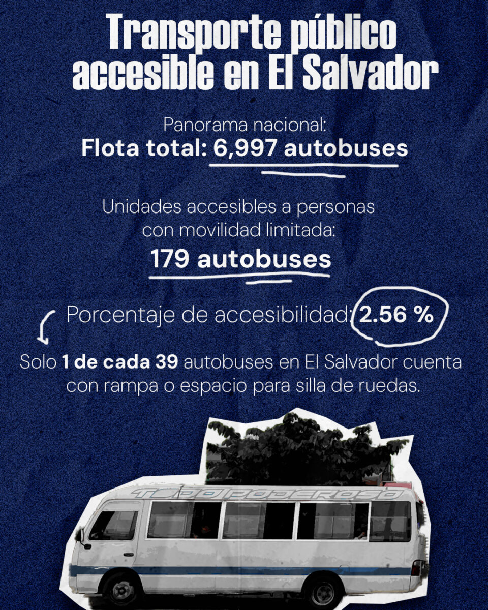 Tras una solicitud de información al Viceministerio de Transporte (VMT) para conocer el número de autobuses inclusivos en el país, la institución reportó solo 179 unidades accesibles en todo El Salvador. Según el propio VMT, la flota nacional suma 6,997 autobuses, lo que equivale a apenas 2.56 % con accesibilidad.