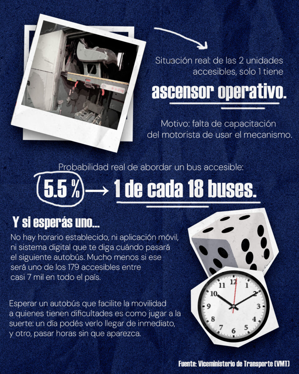 Otra de las limitantes es la incertidumbre diaria sobre cuándo pasará una unidad accesible. No hay horario establecido, ni aplicación móvil, ni sistema digital que informe su llegada. Dentro de las 179 unidades adaptadas en todo el país, no existe forma de saber cuándo una estará disponible en la ruta que se necesita.